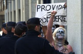 MADRID – Polonahé aktivistky Femenu, s tvárami pomaľovanými kostrami a sloganmi „vaša morálka, moja smrť“ napísanými na telách, napadli pro-life zhromaždenie v Španielsku, ktoré sa konalo v nedeľu 23. marca.