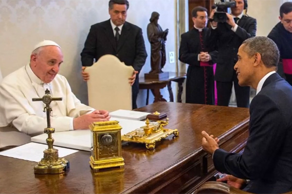 „Tento dar je od pápeža,“ povedal pápež František o prvom medailóne. „Ale tento druhý je od Jorga Bergoglia. Keď som to videl, povedal som si: Dám to Obamovi, je to anjel mieru.“