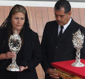 Floribeth Mora Diazová, ktorú sprevádza jej manžel Edwin, nesie relikviu sv. Jána Pavla II. počas sv. omše svätorečenia sv. Jána XXIII. a Jána Pavla II. 27. apríla na Námestí sv. Petra. Uzdravenie aneuryzmy Mory Diazovej v roku 2011 bolo druhým zázrakom sv. Jána Pavla II. v procese jeho svätorečenia.