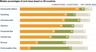 Odpovede sa líšia v závislosti od otázky aj od krajiny. Ale zatiaľ čo antikoncepciu a rozvod schvaľovala všade väčšina populácie, potraty, homosexualita a mimomanželské vzťahy sú považované za morálne neprijateľné u väčšiny respondentov vo väčšine krajín.