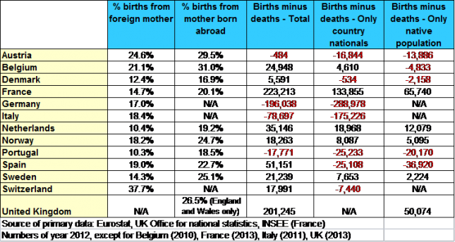 Značný počet ďalších pôrodov: Medzi imigrantmi existuje vysoká miera pôrodnosti, ktorá zodpovedá za 15-40% všetkých detí narodených v európskych krajinách. Napríklad ženy, ktoré sú matkami, viac ako 35% všetkých detí narodených vo Švajčiarsku, sa narodilo inde. V Belgicku a Rakúsku je to 30%, v Spojenom kráľovstve, Švédsku a Nórsku 25%, v Španielsku 22% a vo Francúzsku 20%. V Španielsku môžeme nájsť provincie, kde 35-40% detí sa narodilo rodičom pochádzajúcim zo zahraničia, často z Maroka.