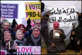 OK – takže teraz znamená upierať ženám „právo“ na potrat to isté ako ich zabiť, zmrzačiť a väzniť ich? Zachrániť život nenarodeného dieťaťa je to isté ako zabiť stovky a tisíce nevinných ľudí? Žena, ktoré nemôže zabiť svoje nenarodené deti sa podobá žene, ktorá má nos porezaný na kúsky za to, že nenosí závoj alebo je ukameňovaná na smrť, pretože bola znásilnená alebo ju strelili do hlavy preto, že bola odvážna pri snahe získať vzdelanie?