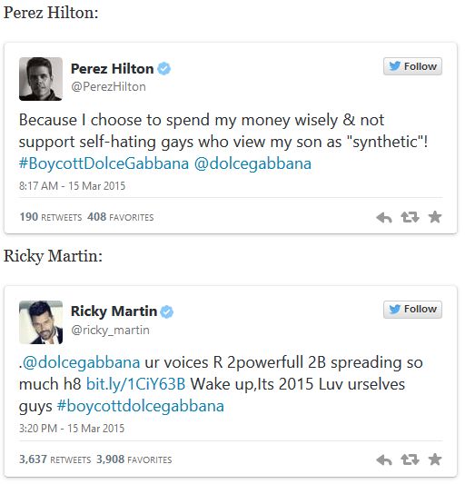 Domenico Dolce a Stefano Gabbana, módne legendy, ktoré sa otvorenie hlásia k homosexuálnej orientácii, v súčasnosti čelia kontroverznej kritike za to, že nesúhlasia s homosexuálnymi ,manželstvami,‘ adopciami detí homosexuálnymi pármi ani s umelým oplodňovaním, pretože, ako sa vyjadrili, veria, že plodenie „musí byť aktom lásky.“