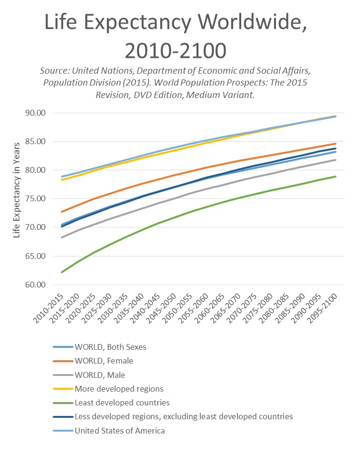 Generácie budúcnosti sa budú môcť tešiť aj na podstatne dlhšiu životnosť. Prirodzená dĺžka života sa pri narodení v raných 50. rokoch 20. storočia odhadovala na 48 rokov u žien a 45 rokov u mužov. V súčasnosti je to u žien 73 rokov a u mužov 68. K roku 2100 sa prirodzená dĺžka života žien zvýši na 82 a vek mužov na 82, pričom v rozvinutých krajinách bude toto číslo pre ženy ešte vyššie – 92 rokov.