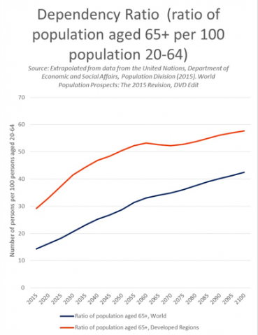 Výzvy 21. storočia nepramenia ani tak z preľudnenia ako skôr z poklesu pôrodnosti a vyššieho počtu starnúcich rovesníkov s porovnateľne menším zastúpením rovesníkov medzi mladými ľuďmi. Do roku 2100 bude v krajinách s vysokým a stredným príjmom počet osôb závislých na inej osobe (teda dospelí nad 65 rokov a mladí pod 20 rokov) predstavovať polovicu celkovej populácie, viac ako 37%, ktoré sú v dnešnej dobe.