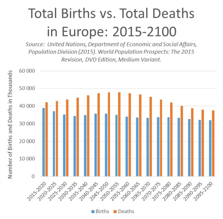 Kým v rokoch 2015 – 2020 počet úmrtí v Európe prevýši počet narodených detí o 3,2 milióny, v priebehu polstoročia sa toto číslo zvýši štvornásobne. V Japonsku a v desiatich európskych krajinách klesne do roku 2050 počet ich obyvateľov o 15%.